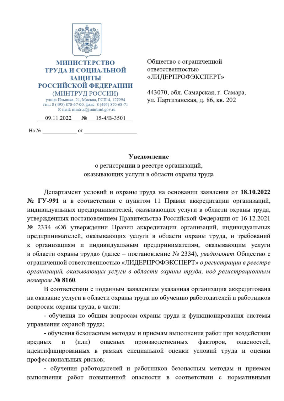 Аккредитации Минтруда РФ на оказание услуг в области охраны труда по обучению работодателей и работников. Регистрационный № 8160 от 09.11.2022 г.