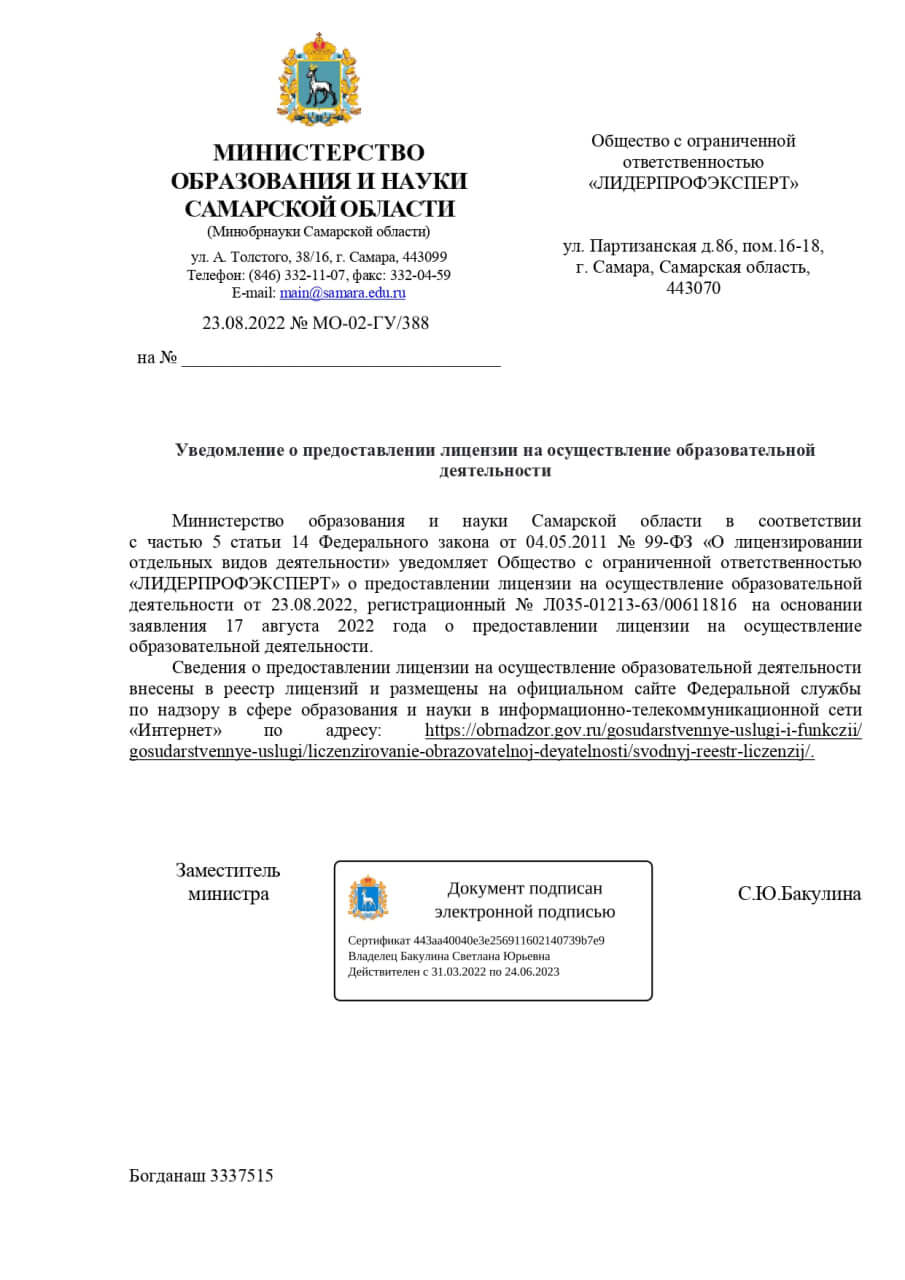 Лицензии № Л035-01213-63/00611816 от 23.08.2022 г.